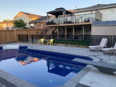 Complete backyard installation...metal shell pool with a concrete bottom, diving board, interlock, fences and deck. Complete with gas BBQ hookups and gas fireplace area.