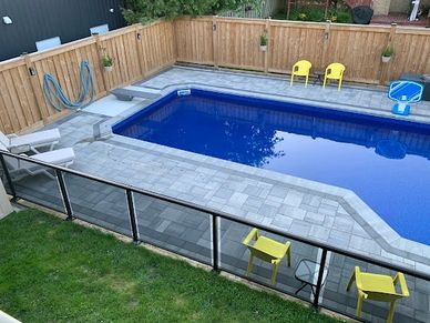 A refreshed backyard look while maintaining a budget, interlock pavers joining to the existing concrete pool walkway is a great way to revitalize the look of your backyard without a major overhaul.